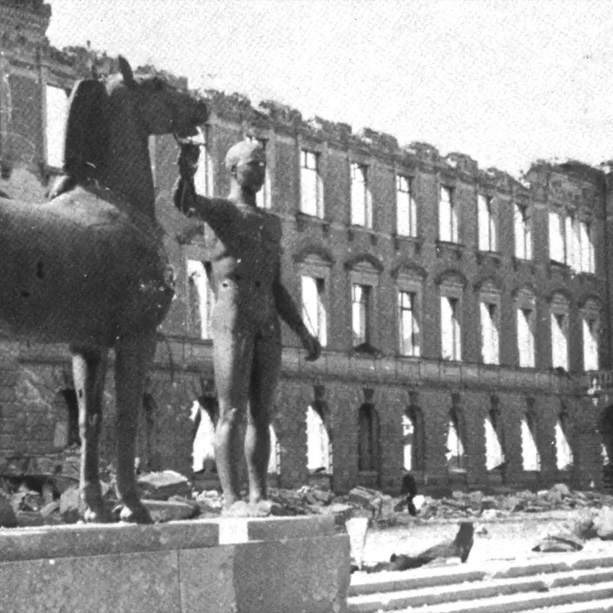 Das zerstörte Hauptgebäude nach dem zweiten Weltkrieg 1945.